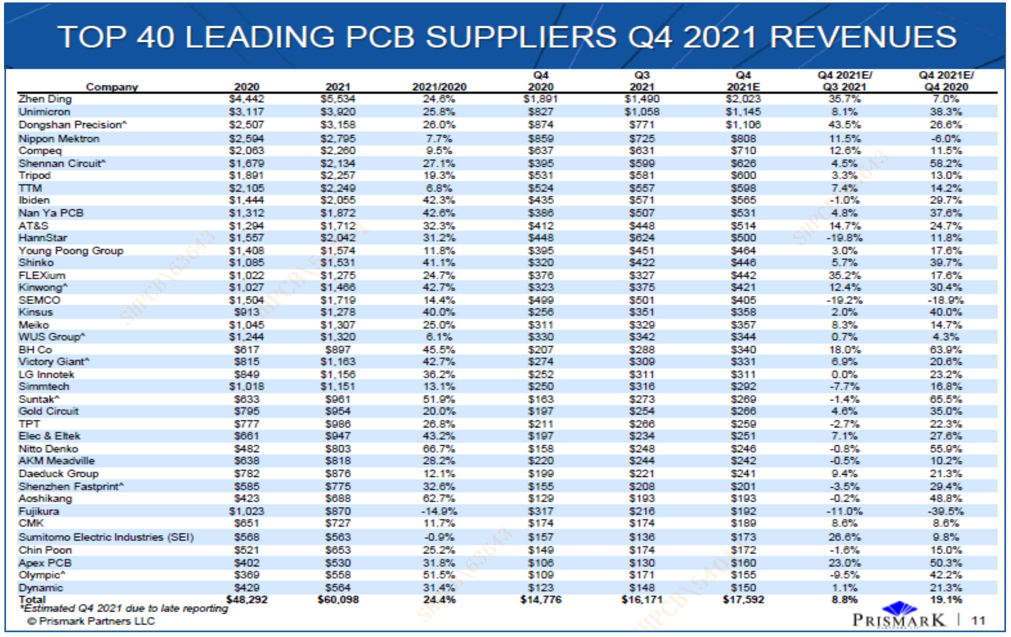 近期,國際知名電子行業咨詢集團Prismark Partners發布2021年第四季度全球40強PCB企業排行榜與數據分析報告,共有七家內資企業上榜。其中,金年會科技在2021年第四季度全球PCB企業四十強排行榜中位列第22名,在內資PCB企業中位列第4名。